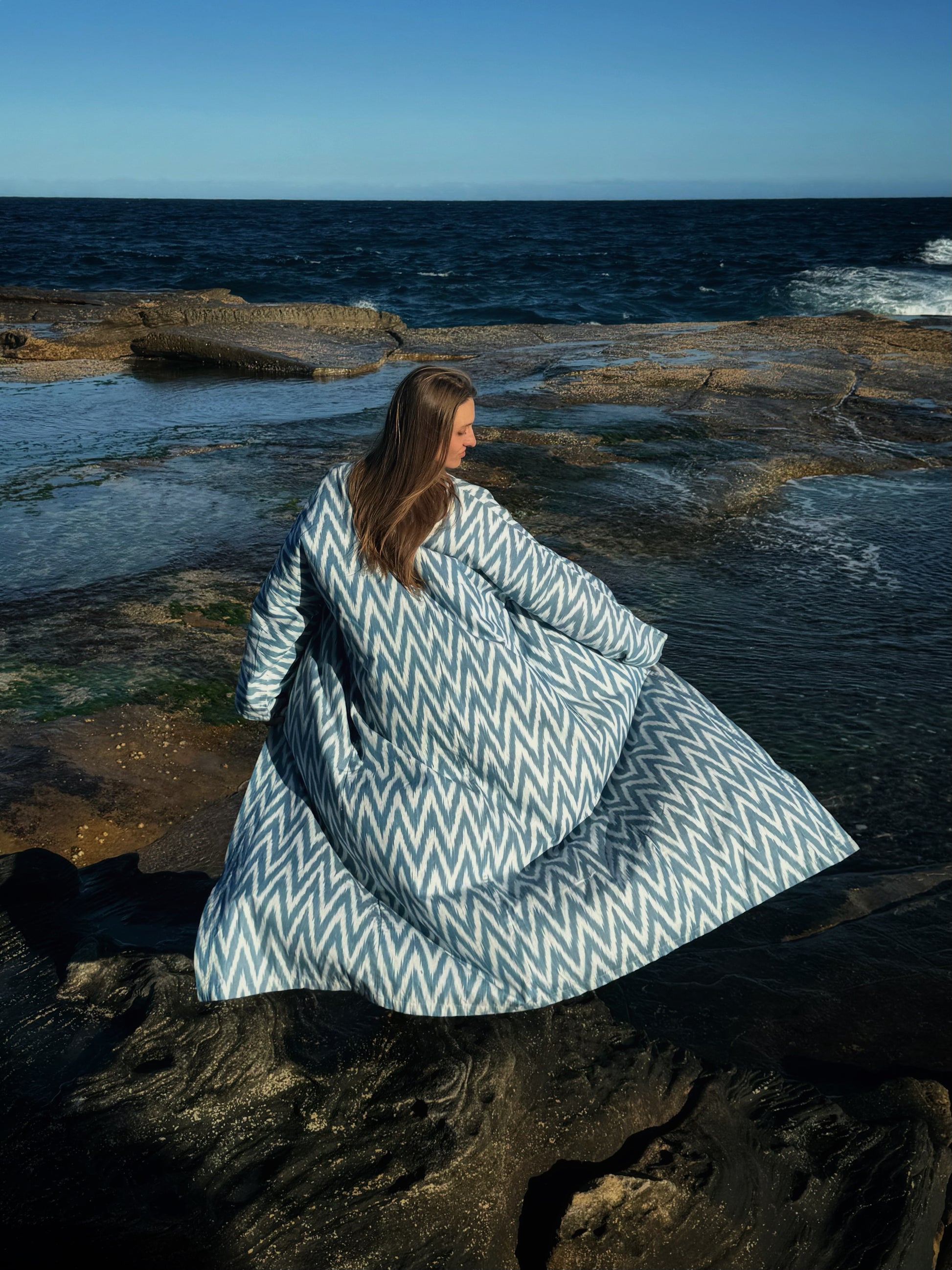 Handwoven by master artisans in Uzbekistan, each piece is created through a meticulous, multi-step process that makes it truly one of a kind. Naturally dyed threads may result in subtle colour variations, while slight texture irregularities in the fabric add authenticity and charm, celebrating the artisanal nature of the kaftan.